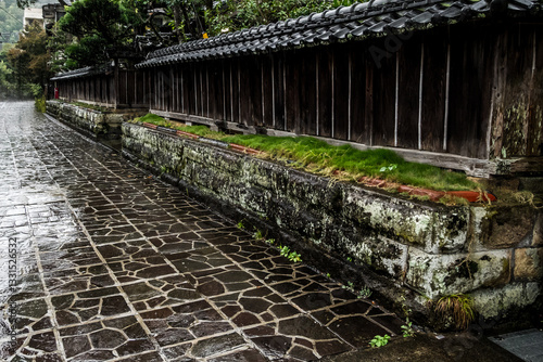 雰囲気の良い古い温泉街の石畳が静かに雨に濡れて黒く見える