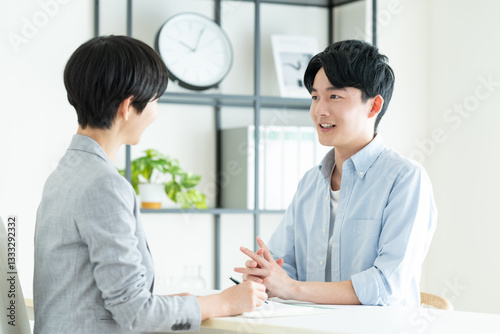 consultation, counseling, planner, man, woman, young, adviser, adviser, smile, speaking, conversation, hear, japanese, people, waist up, face, casual, two people, table, seated, indoor, refer, version, proposal, reception, business, office, office, smiling, communication, chat, man, woman, guidance, consultancy