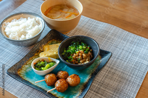 table, breakfast, yakitori, miso soup, rice, vegetable, handcraft, meal, dish, delicious, foodstuff