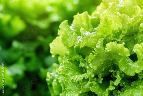 新鮮なレタスの葉が陽の光を受けて輝く春の農場の風景