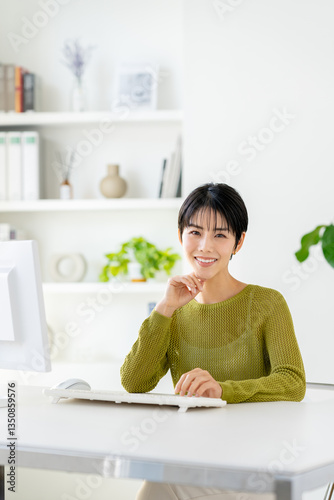 business, office, woman, young, japanese, people, missy, personal computer, computer, work, work, 30s, desk, table, casual, indoor, engineer, copy space, black hair, short hair, keyboard, woman, smiling, technology, online, person, indoor, search, seek, examine, thought, contemplate