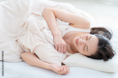 go to bed, morning, woman, sleep, deep sleep, people, smile, lifestyle, new life, bedchamber, bedchamber, pajama, health, health care, house, room, sleep, relax, casual, singlet, summer, sack, long hair, black hair, 30s, japanese, waist up, asian, indoor, profile, sleep, woman, bed, sleep, bedchamber, morning, beauty, home, pillow, relaxation, indoor