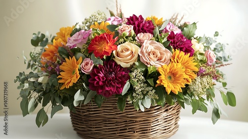 バスケットに入った色とりどりの華やかなフラワーアレンジメント