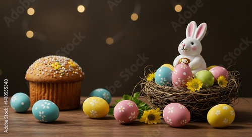 rabbit, ornament, egg, easter egg, nest, cake, muffin, flower, yellow, pink, blue, green, colourful, sweet, spring, table, woody, background, light, photo, image, decoration, confectionery, sweet, sweet, table, dish, food, motif, decoration, festival, event, festival, party, gathering, item, material, picture, illustration, design, pattern, pigmentation