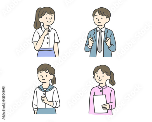 woman, boy, student, uniform, teacher, teacher, training, people, blazer, ponytail, cravat, white background, school, japanese, young, pose, school, waist up