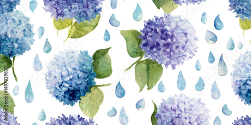 rainy season, rain, dew, waterdrop, watercolor, pattern, background, decoration, design, plant, flower, season, nature, garden, blue, purple, pink, gradation, refreshing, healing, natural, seamless, floral, sweet, trend, classic, wallpaper