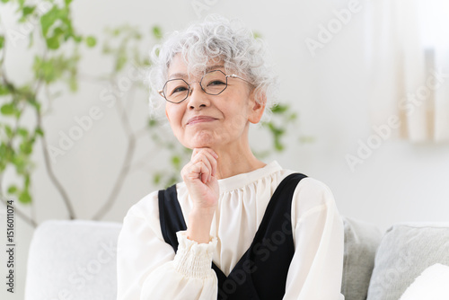 portrait, people, person, woman, woman, japanese, japan, asia, aged, aged, aged, 50's, 60's, glasses, solo, grandparent, nanny, couch, cushion, house, home, room, drape, positive, contemplate, planning, smile, smile, seated, white background, indoor, indoor, copy space