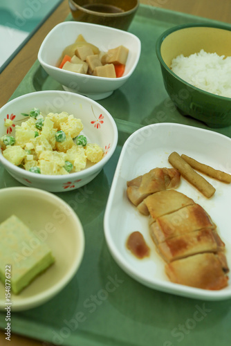 病院食、ご飯、チキンステーキ、高野豆腐、ポテトサラダ