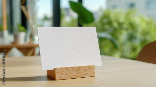 木製カードスタンドに立てた白い無地カードのモックアップ(室内・自然光・テーブル上)
