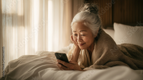 高齢の優しい表情の女性が布団でスマホを覗き込む姿