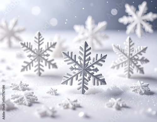 グレーのぼやけたイルミネーションの背景に複数の雪の結晶のオーナメントのあしらい