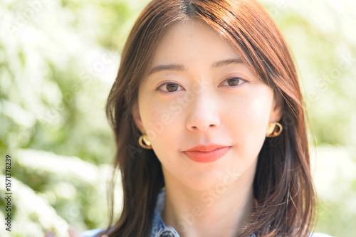 woman, cosmetic, smile, beauty, japanese, people, young, lifestyle, portrait, copy space, waist up, 30s, relax, light, houseplant, shortcut, short hair, beige, ultraviolet, sunblock, beauty, cosmetic, make-up, park, beauty, coiffure, clean, lovely, casual, natural, spring, skincare, green, hair care, plant
