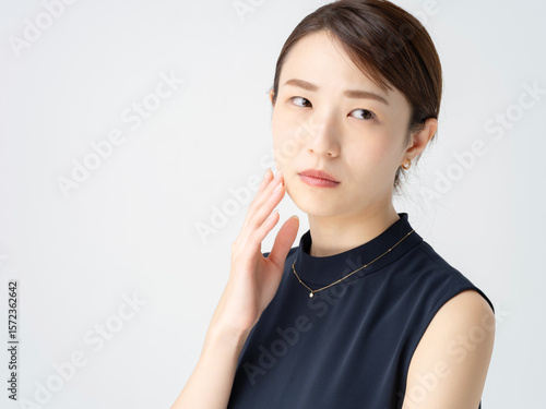 woman, cosmetic, skincare, contemplate, unrest, apprehension, hair, coiffure, coiffure, hair, make-up, make-up, hair salon, business, work, work, model, japanese, asian, dress, party, get-together, portrait, 30s, hairstylist, beauty, skin, face, fashion, cosmetic, white, white background