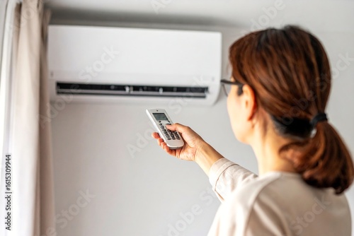 air conditioner, brownout, global warming, remote control, operation, woman, saving, temperature, adjustment, switch, cooler, air conditioning, air cooling, heating, power, electricity, energy, summer, winter, eco, ecology, hot, cold, copy space, lifestyle, people, homemaker, appliance, home, japanese