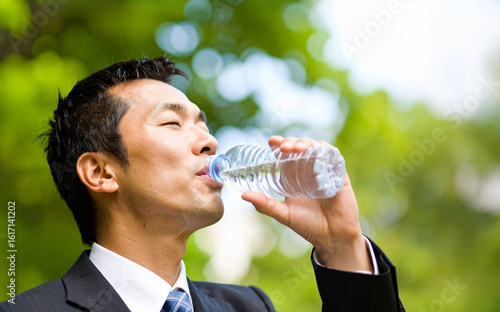 people, plastic bottle, japanese, open air, suit, man, mineral water, water, business, drink, businessman, break, waist up, hot, employee, work, sweat, green, salaried employee, verdure, copy space, 30s, heat wave, business district, portrait, possess, middle-aged, lifestyle, smile, 50's, cravat, corporation, building, drink, work