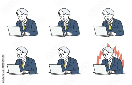 man, businessman, personal computer, notebook, work, working, expression, change, surprised, rejoice, contemplate, resent, hustle, fire, office, reaction, feeling, illustration, rendering, suit, work, staff, stress, solemn, concentration, embarrassment, freelance