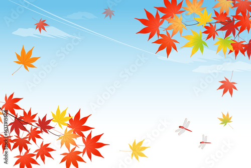 fall, background, frame, banner, vector, wallpaper, leaf, plant, sky, blue skies, frame, illustration, decoration, natural, nature, view, landscape, sum, pretty, lovely, vivid, full bloom, red, orange, illustration, walk, journey, material, travel, dragonfly, copy space, japan