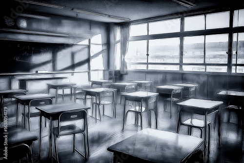 classroom, peace, school, desk, chair, window, training, space, monochrome, landscape, light, shadow, photo, illustration, image, background, wallpaper, material, blog, copy space, banner