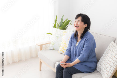 people, woman, japanese, asian, homemaker, black hair, 50's, 60's, middle-aged, aged, aged, aged, pension, elderly, nanny, room, lifestyle, couch, smile, smile, smartphone, smartphone, call, mobile phone, cyberspace, net, web, mail, search, message, app, pursuit, game, break, videophone, trouble, contemplate, thought, imagination, idea