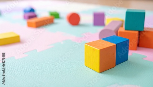カラフルな木製ブロックと柔らかなパステルマット