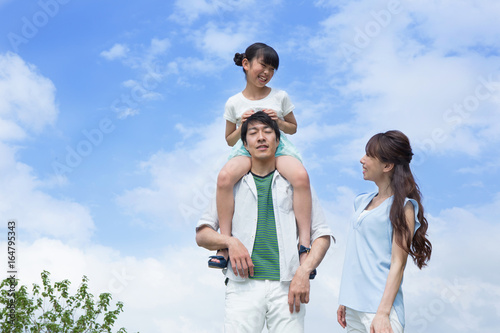 people, japanese, asian, man, husband, father, father, woman, wife, mother, mother, couple, family, girl, pretty, daughter, children, family, open air, park, grass, nature, blue skies, sunny, copy space, picnic, lifestyle, relax, trip, happy, love, live, lohas, stand, future, grow, piggyback, high, tingle, waist up, smile