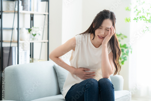 woman, abdominal pain, marode, pain, stress, health, health care, cephalalgia, drop, fatigue, fatigue, overwork, lifestyle, new life, casual, house, people, smile, relax, homemaker, vacation, relax, seated, couch, 30s, home, home, indoor, japanese, long hair, black hair, asian, waist up, profile, couch, woman, couch, indoor, room