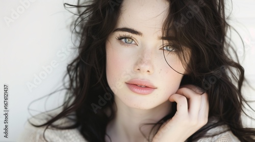woman, portrait, freckle, blue eye, closeup, highlight, background, black hair, straight hair, long hair, pitiful, race, daintiness, sophistication, model, woman, beauty, face
