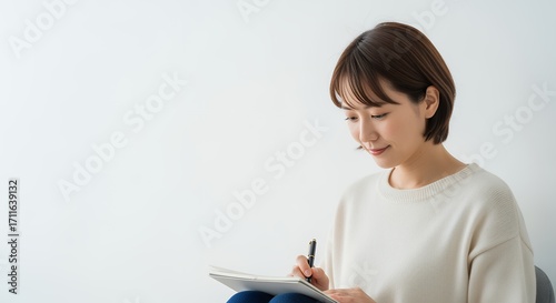 noto, write, woman, japanese, study, journal, planning, portrait, pen, room, indoor, white background, copy space, light