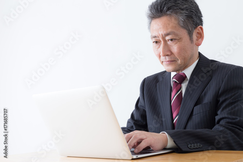 people, man, japanese, asian, white background, room, indoor, indoor, 50's, 60's, middle-aged, aged, aged, aged, elderly, uncle, business, businessman, salaried employee, suit, employee, staff, corporation, work, work, office, personal computer, personal computer, notebook, cyberspace, web, mail, search, examine, seated, typing, boss, president, manager, solemn, earnest, concentration