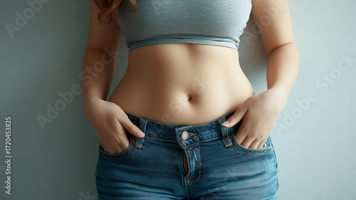 japanese, woman, belly, belly button, torso, hip, skin, jean, denim, buttons, zip, pocket, rivet, stitch, hip, fat, bump, underclothes, waist, dimension, indoor, wall, background, vertical, attitude, casual, dress, dress, line, shape, fold, fold, clasp, textile, cotton, texture