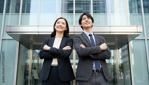 look up, colleague, business building, japanese, two people, business, cooperation, future, hope, teamwork, suit, open air