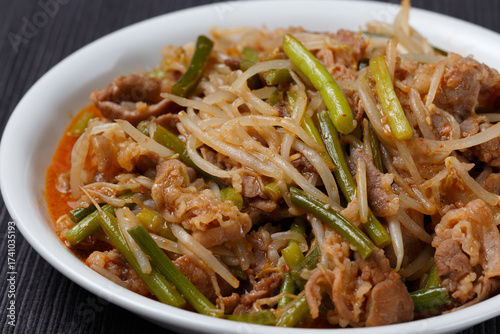 pork, bean sprouts, stir fry, meal, side dish, side dish, dish