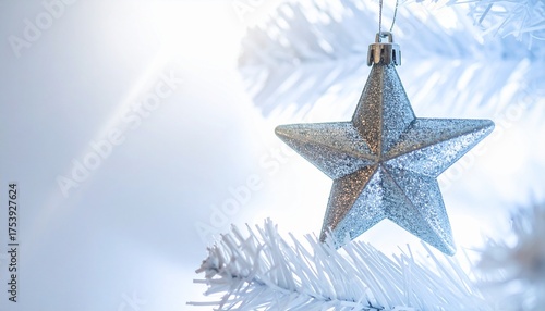 クリスマスツリーの銀色の星のオーナメント、白いクリスマスツリーのコピースペース
