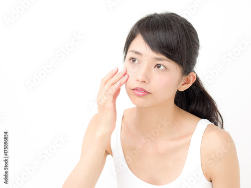 eye, trouble, contemplate, apprehension, unrest, disapproval, woman, skincare, cosmetic, beauty, girl, young, skin, face, alone, bare skin, cheek, people, adult, student, difficulty, pretty, clean, model, japanese, asian, white, white background, make-up, make-up, hand, este
