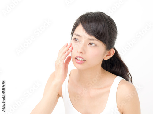 eye, trouble, contemplate, apprehension, unrest, disapproval, woman, skincare, cosmetic, beauty, girl, young, skin, face, alone, bare skin, cheek, people, adult, student, difficulty, pretty, clean, model, japanese, asian, white, white background, make-up, make-up, hand, este