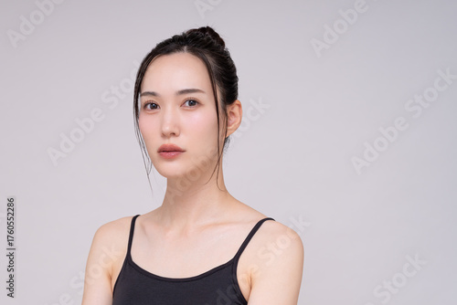 skincare, bare skin, cosmetic, skin, woman, young, missy, beauty, beauty, pointer, japanese, people, lifestyle, health, health care, white background, natural, black, cami, camisole, waist up, portrait, copy space, lovely, clean, 30s, beauty, woman, face, glamour, model, smile, smile, felt, solemn, earnest, boredom