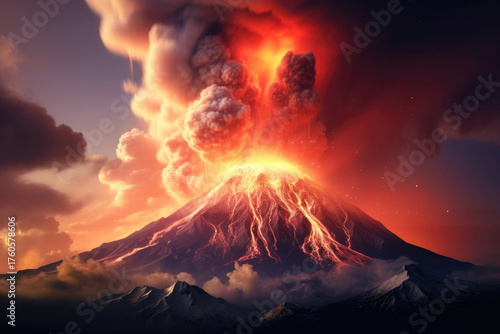 赤い溶岩と噴煙を上げる活火山の壮大な噴火シーン