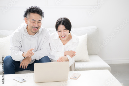 couple, smile, speaking, conversation, personal computer, examine, look, couch, search, seated, couple, insurance, move, family, marriage, dining, light, happy, japanese, people, two people, plural, lifestyle, man, relax, table, woman, cyberspace, casual, room, house, waist up, 30s, coffee, chum, fun, family, middle-aged, asian, technology, smile, together, home