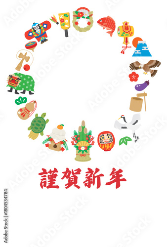 vector, illustration, happy new year, new year's day, material, sweet, kadomatsu, new year, crane, battledore, sea bream, hawk, fuji, japan
