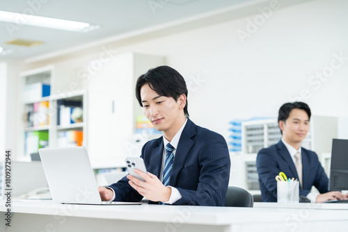 smartphone, businessman, office, business, man, young, newcomer, suit, cravat, desk, table, waist up, face, indoor, corporation, corporate, office, office, copy space, work, work, personal computer, notebook, people, japanese, employee, salaried employee, seated, smartphone, mobile, mobile phone, look, search, seek, examine, app, cyberspace, smile, computer, smiling