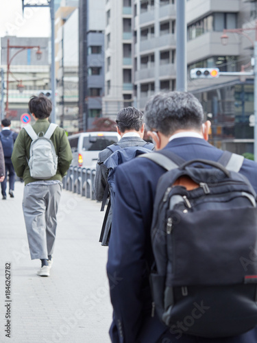 朝の通勤時間の東京都内の街で歩く通勤客の姿