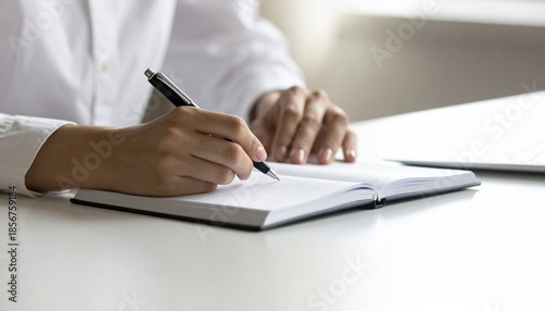 ノートの上でペンを構え、書き始める直前の学習シーンを表現。 やわらかな自然光とニュートラルな色調が信頼感を与えます。 中央に広い余白を確保し、広告コピーや見出し配置に最適。 教育、研修、自己学習向けの商用ストック素材です。