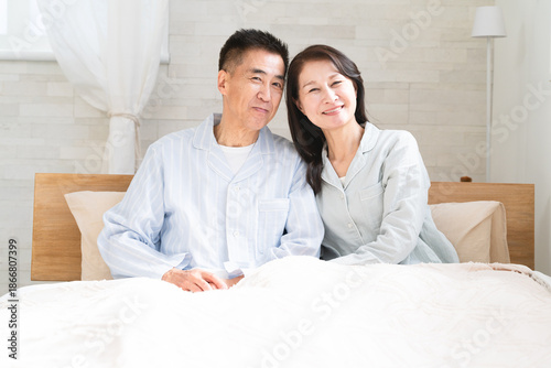 portrait, model, woman, man, woman, man, japanese, japan, 50's, 60's, middle-aged, age, aged, couple, two people, go to bed, awake, awakening, stir, smile, smile, speaking, conversation, morning, sleep, bed, bedding, pillow, pillow, chum, positive, health, poor health, marode, hospital, insomnia, white, natural, indoor, copy space