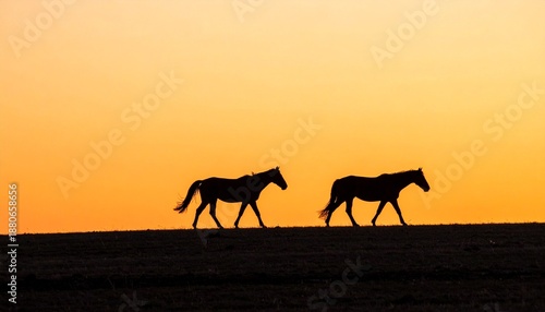 夕焼け空に歩く二頭(二匹)の馬のシルエット