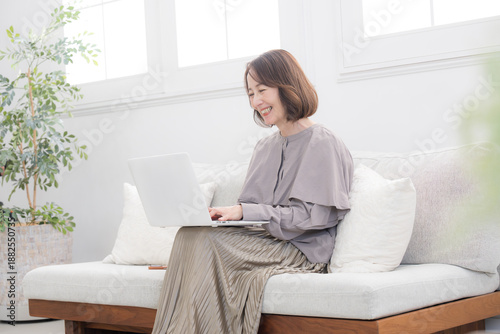personal computer, woman, aged, reservation, application, 60's, study, search, contemplate, examine, question, japanese, people, smile, lifestyle, notebook, relax, indoor, casual, relax, light, sweet, indoor, couch, home, house, homemaker, beauty, waist up, pretty, home, personal computer, work, portrait, copy space, room, seated, mail, asian, cyberspace, green