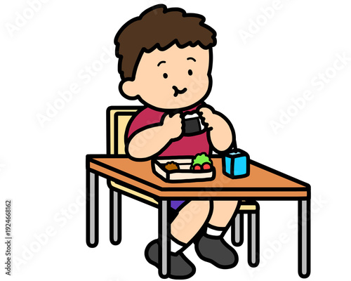 ランチタイム 机でおにぎりを食べるアジア人の男の子