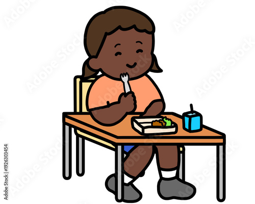 girl, children, meal, dinner, lunch, school, classroom, fork, meal, table, training, smile, sweet, black man, black hair