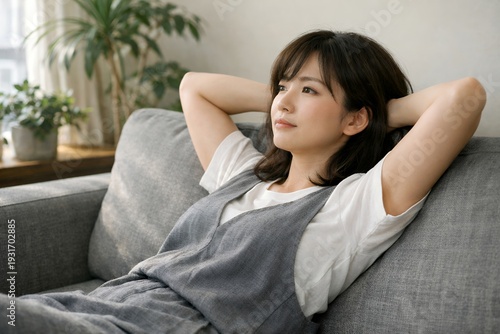 couch, relax, break, woman, indoor, house, profile, seated, lifestyle, vacation, relax, peace, calm, satisfaction, smile, hair, t-shirt, grey, clothes, indoor, daytime, japanese, people, portrait, adult, adult, youth, waist up