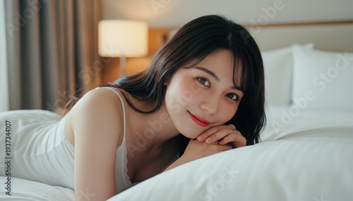 woman, missy, asian, japanese, camisole, white, bedchamber, bed, sprawl, smile, smile, relax, vacation, morning, awakening, cleanliness, skincare, black hair, long hair, relax, lifestyle, cosmetic, health, pretty, portrait, people, indoor, hotel, accommodation, happy, pleasant, bare skin, inner, underclothes, rest, sleep
