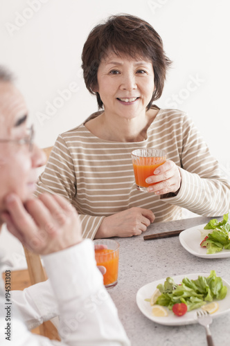 people, japanese, 50's, 60's, aged, dish, woman, homemaker, man, couple, family, smile, smile, fun, relax, health, salad, vegetable, indoor, indoor, meal, drink, food and drink, meal, diet, cosmetic, alimentation, breakfast, table, food, morning, vegetarian, copy space